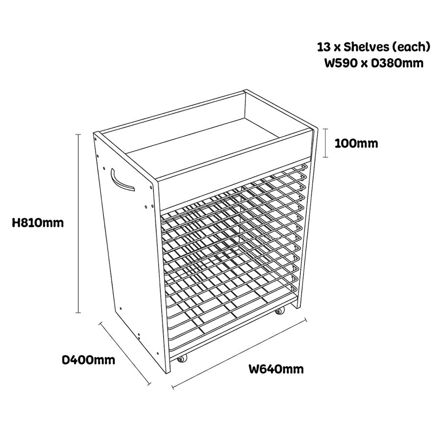 This art and craft mobile display unit comes with 13 shelves for maximum storage and drying of artwork (each shelf W590 x D380mm). An art drying rack gives each individual painting its own place to air dry quickly without getting damaged. A great way to organise and locate your children's paintings with separate racks for each picture or poster. Useful top shelf for storage of paint pots etc. (100mm deep side rails). Shelves pull out for easy cleaning. Supplied flat packed for simple assembly.