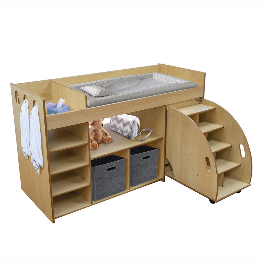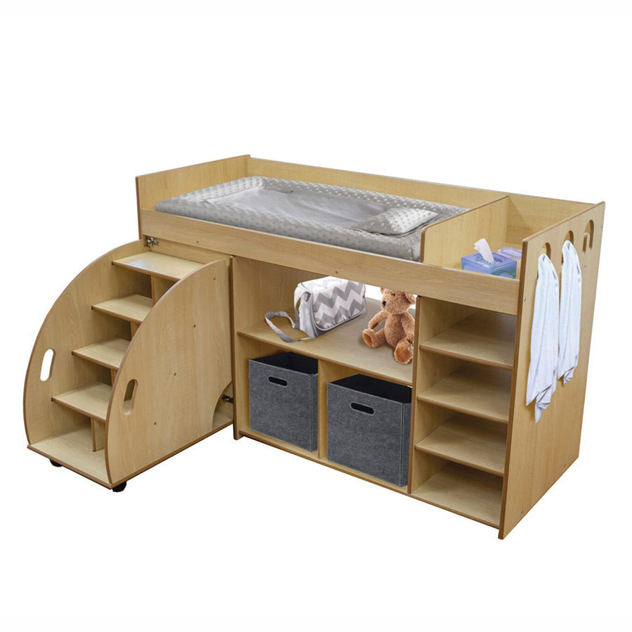Includes pull out steps for toddlers to make their own way to the top. Steps encourage independence and also help to reduce repeated lifting for staff/parents. The stairs can be assembled at either side of the unit, secured in place using robust locking castors and stored underneath when not in use. Clever hooks cut out of the MDF give a risk-free hanging space, along with ample storage underneath accessible from both sides. Conforms to BS EN12221.