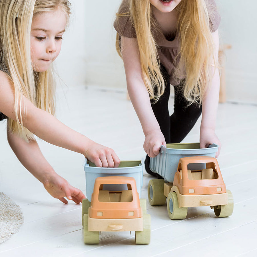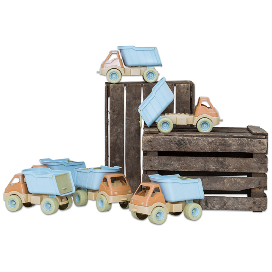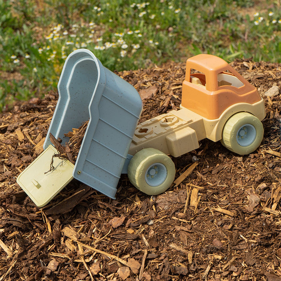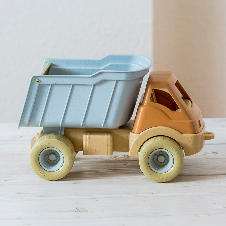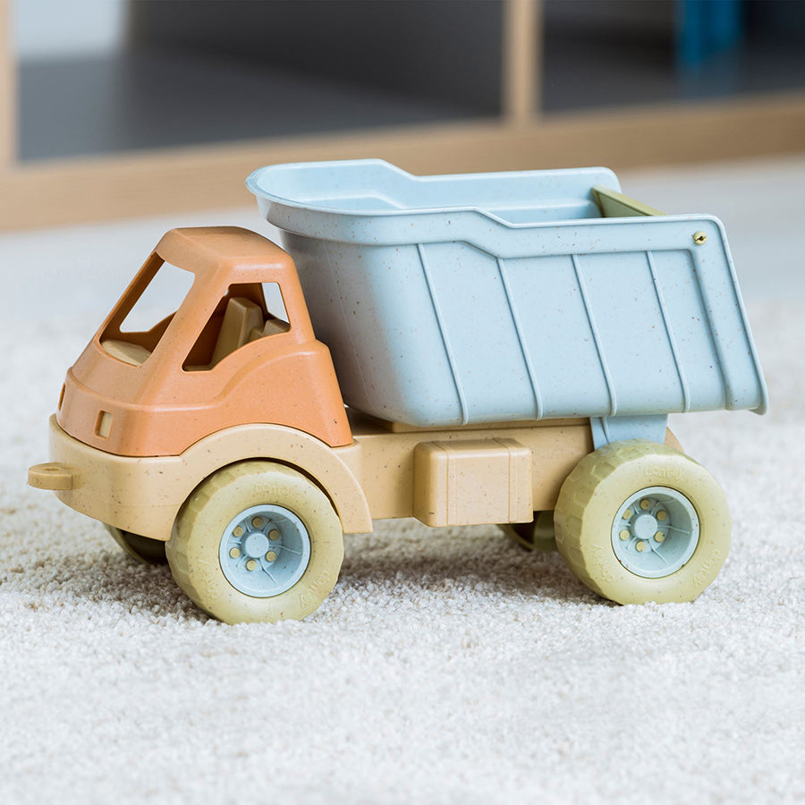 Solid and durable truck in new trendy colors, made of swan-labeled bioplastic (sugarcane), with a discharge mechanism for unloading materials like sand. Great for play, both indoors and outdoors.