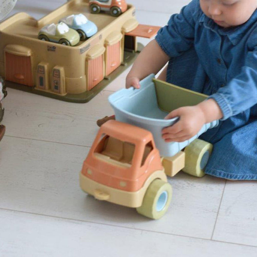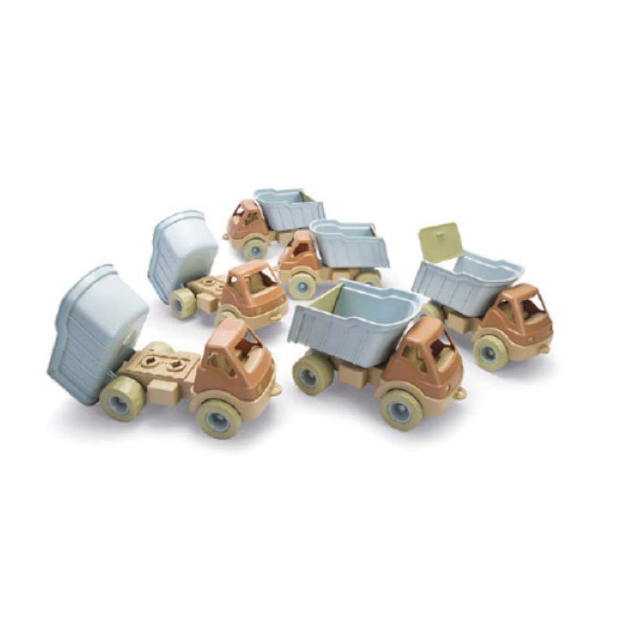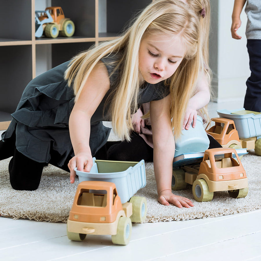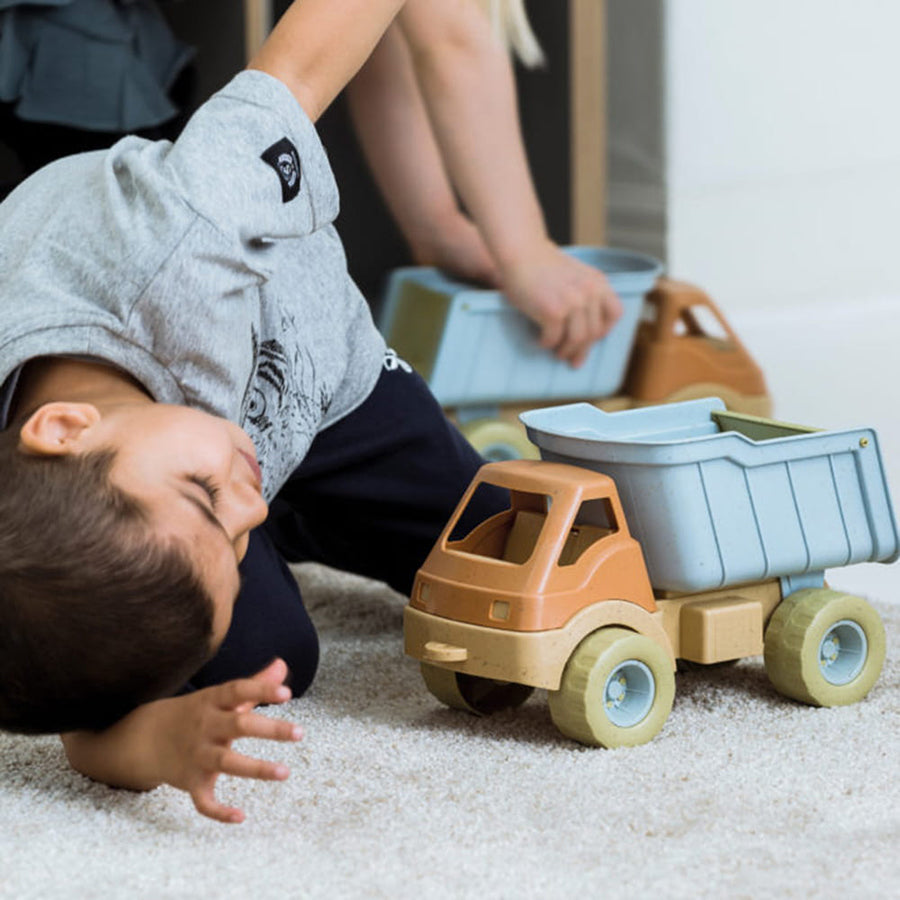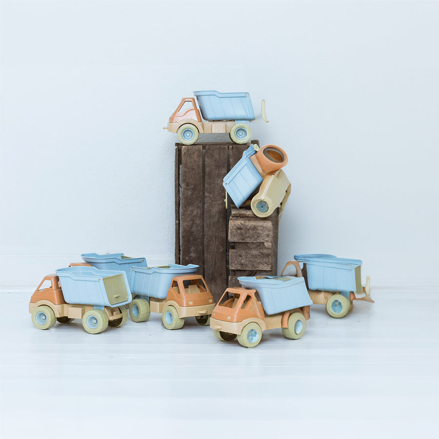 Solid and durable truck in new trendy colors, made of swan-labeled bioplastic (sugarcane), with a discharge mechanism for unloading materials like sand. Great for play, both indoors and outdoors.