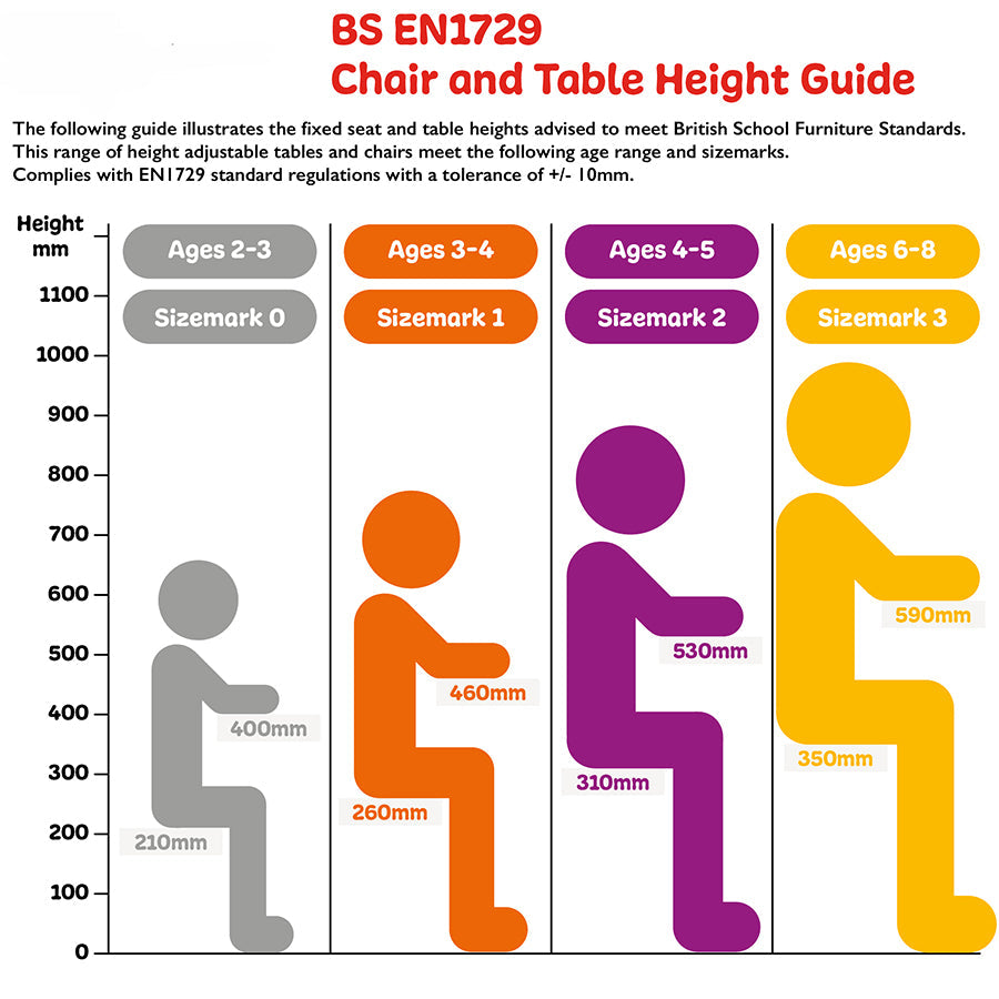 | Size Mark | Age Range | Seat Height (mm) | Height (mm) | Width (mm) | Depth (mm) |