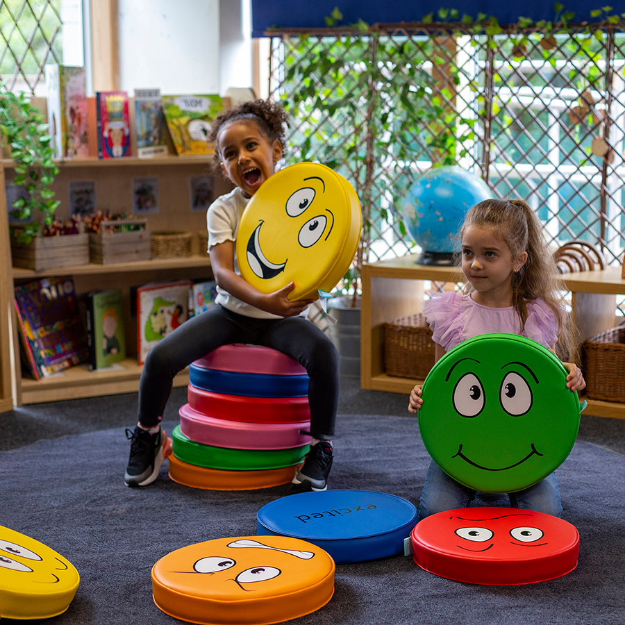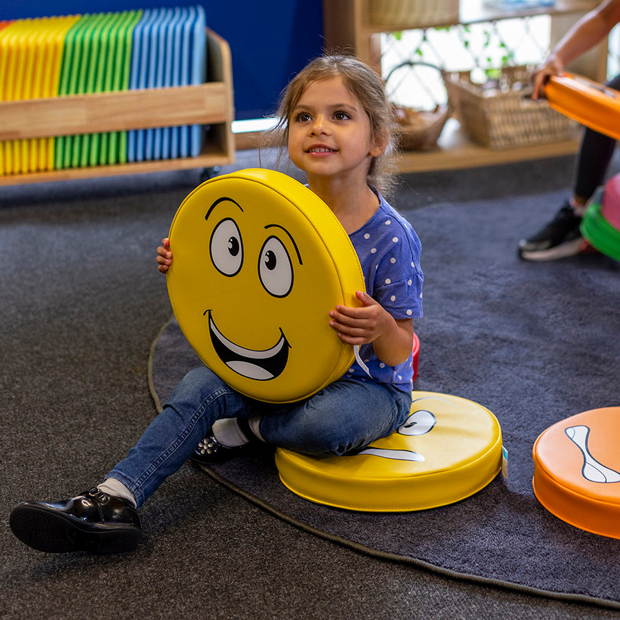 Pack of six cushions with facial expressions printed on one side, and English descriptions on the other.