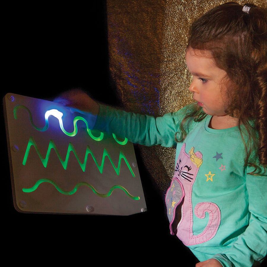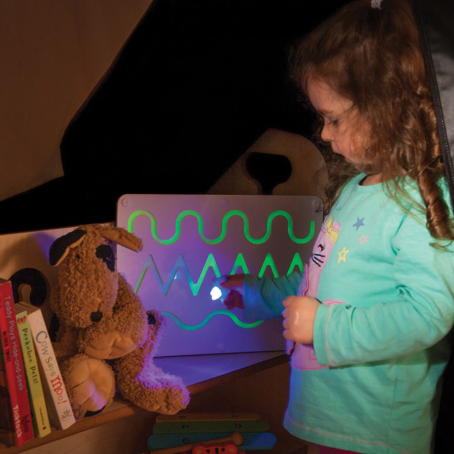 This Glo board invites children to use the UV pen to track the shaped groves in the board, developing fine motor skills and hand-eye co-ordination. As the pattern lights up, it gives a child an instant reward and will encourage them to do it again and again, making the activity self-rewarding.