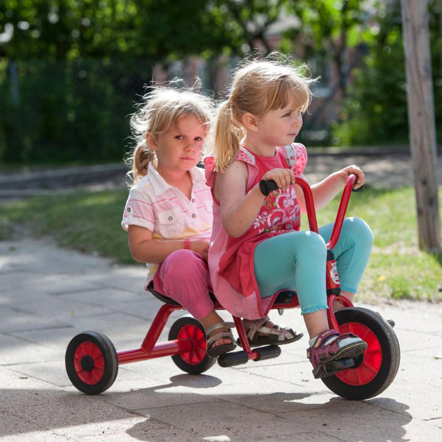 A trike for two children. The passenger seat encourages the driver to take his best friend for a ride on the playground. Hours of fun for both of them.
