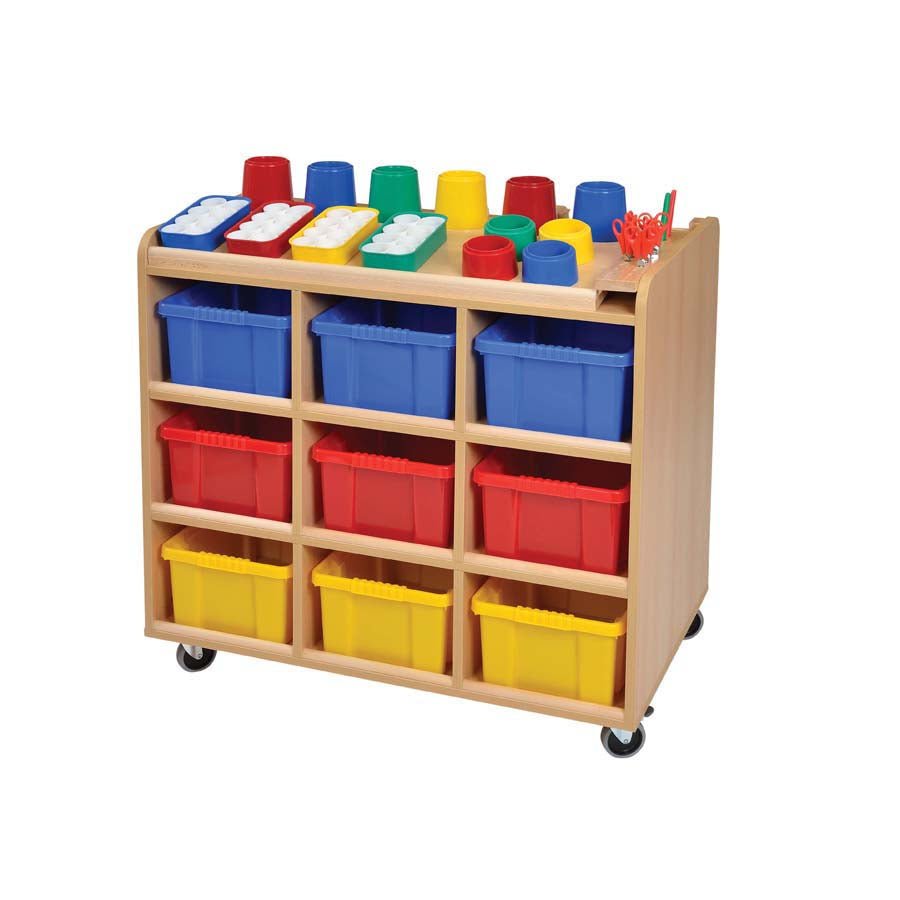 The ultimate double sided Art Resource Trolley unit has a “built in” scissor block and specific sections for all your art and craft needs including paper, paints, resources and ribbon. On one side, there are 9 storage compartments large enough to accommodate deep plastic trays or willow baskets which can be purchased separately if required. A set of quality castors can be fitted enabling the item to be moved freely around your learning environment.