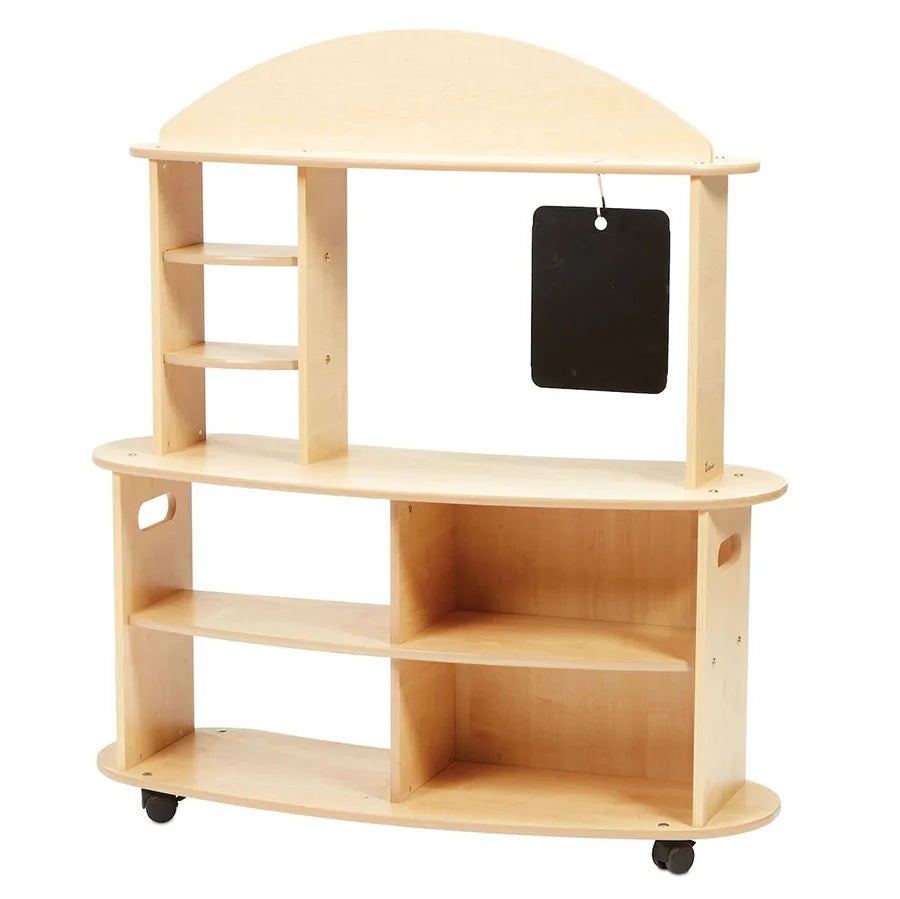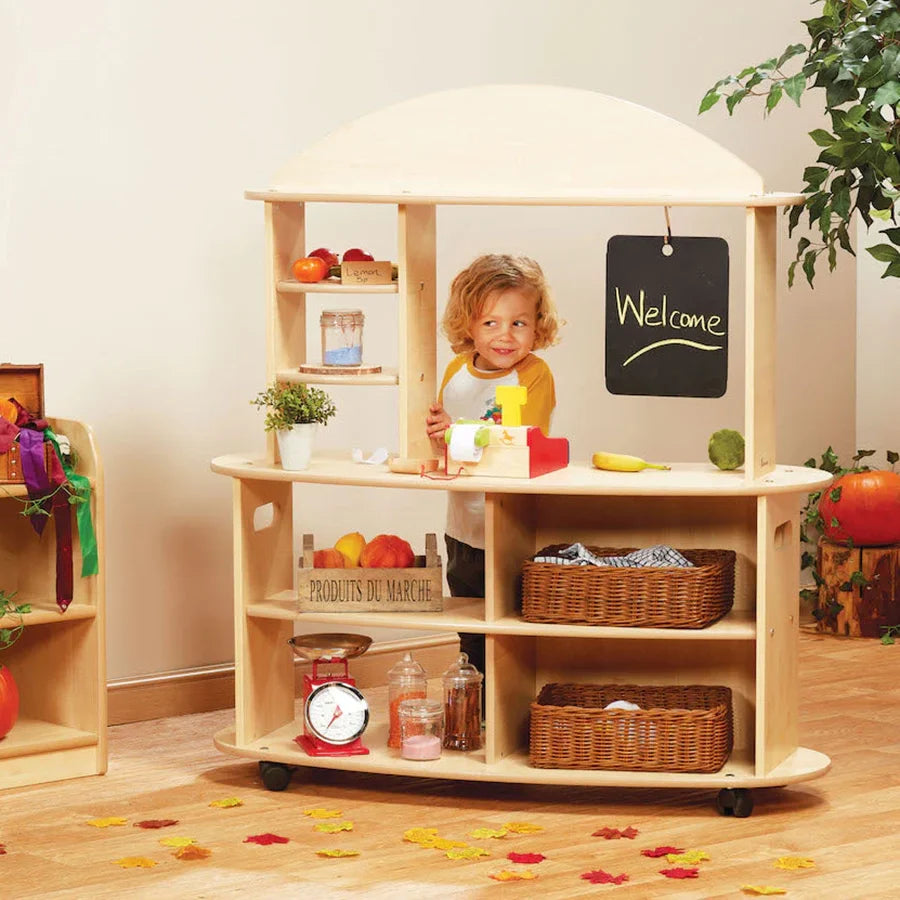 A charming mobile market that is perfect for encouraging group role play. The natural maple melamine finish is hard-wearing and easy to clean. Features include multiple storage shelves for resources and toys, plus lockable, anti-scratch castors.