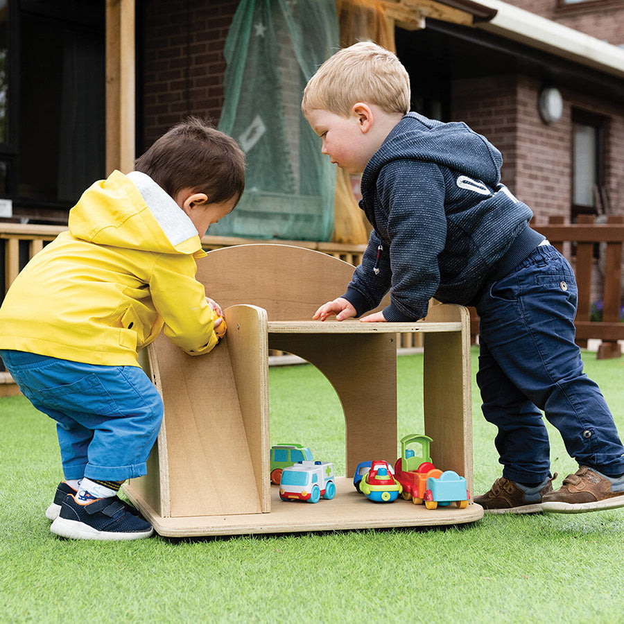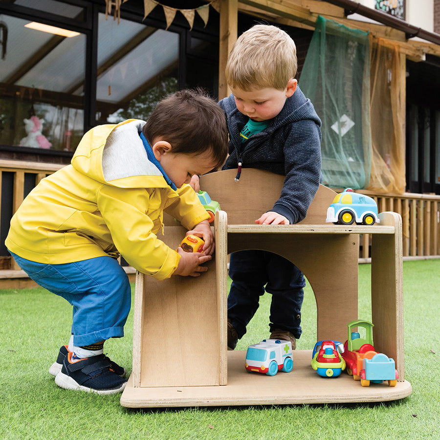 This outdoor garage is ideal for creating a permanent small world area in your outside space. Features parking spaces over two levels and a ramp.