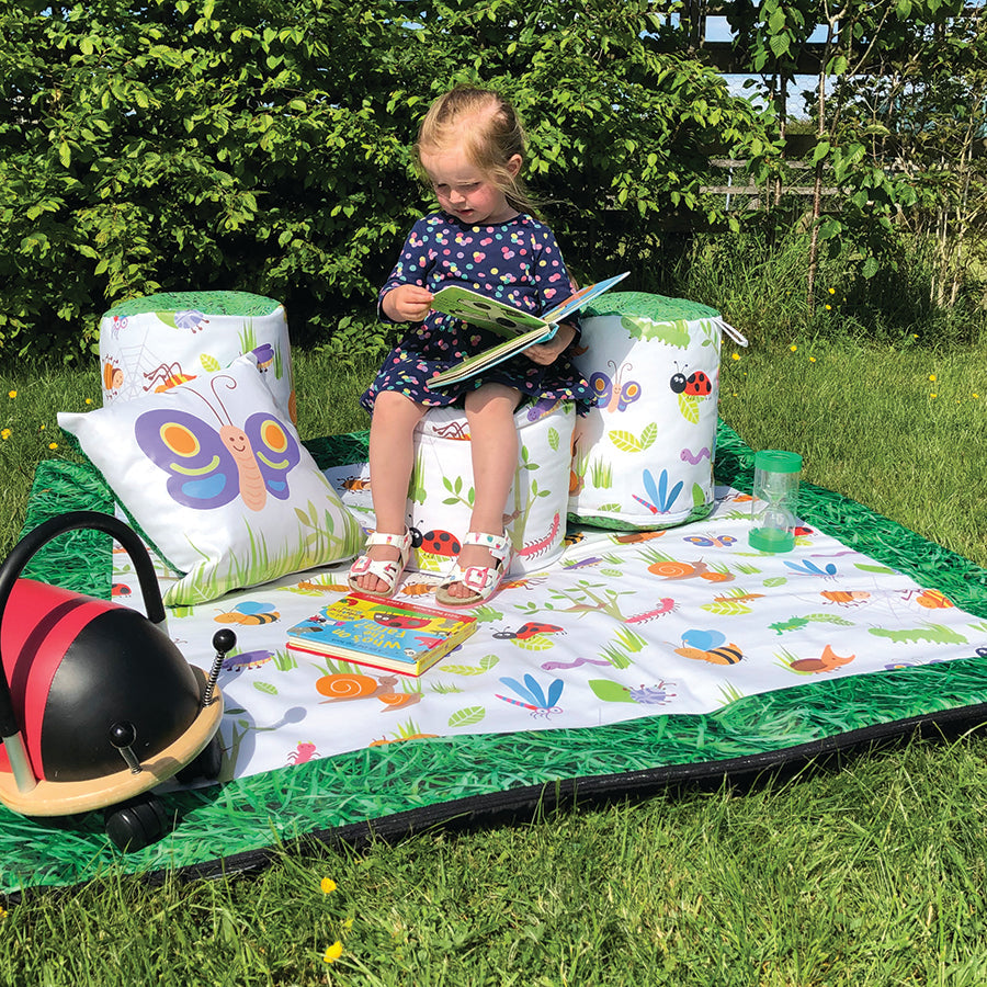 Exclusive to Morleys these nautre themed pouffes are suitable for foundation stage and key stage 1 aged children. Supplied as a set of 3 each pouffe has a mini beast design around the sides and a grass print on the top and bottom. The inner is filled bead and the outer has a PVC coating which is waterproof and wipe clean, so the pouffes can be used indoors or outdoors.
