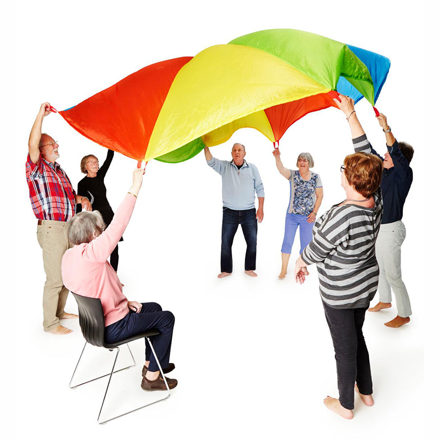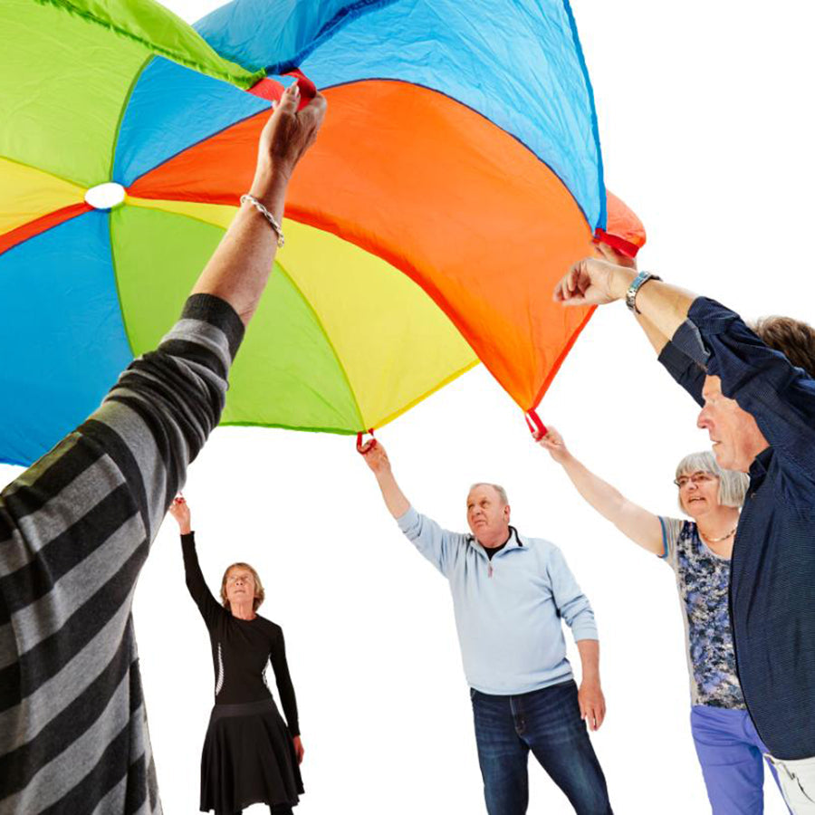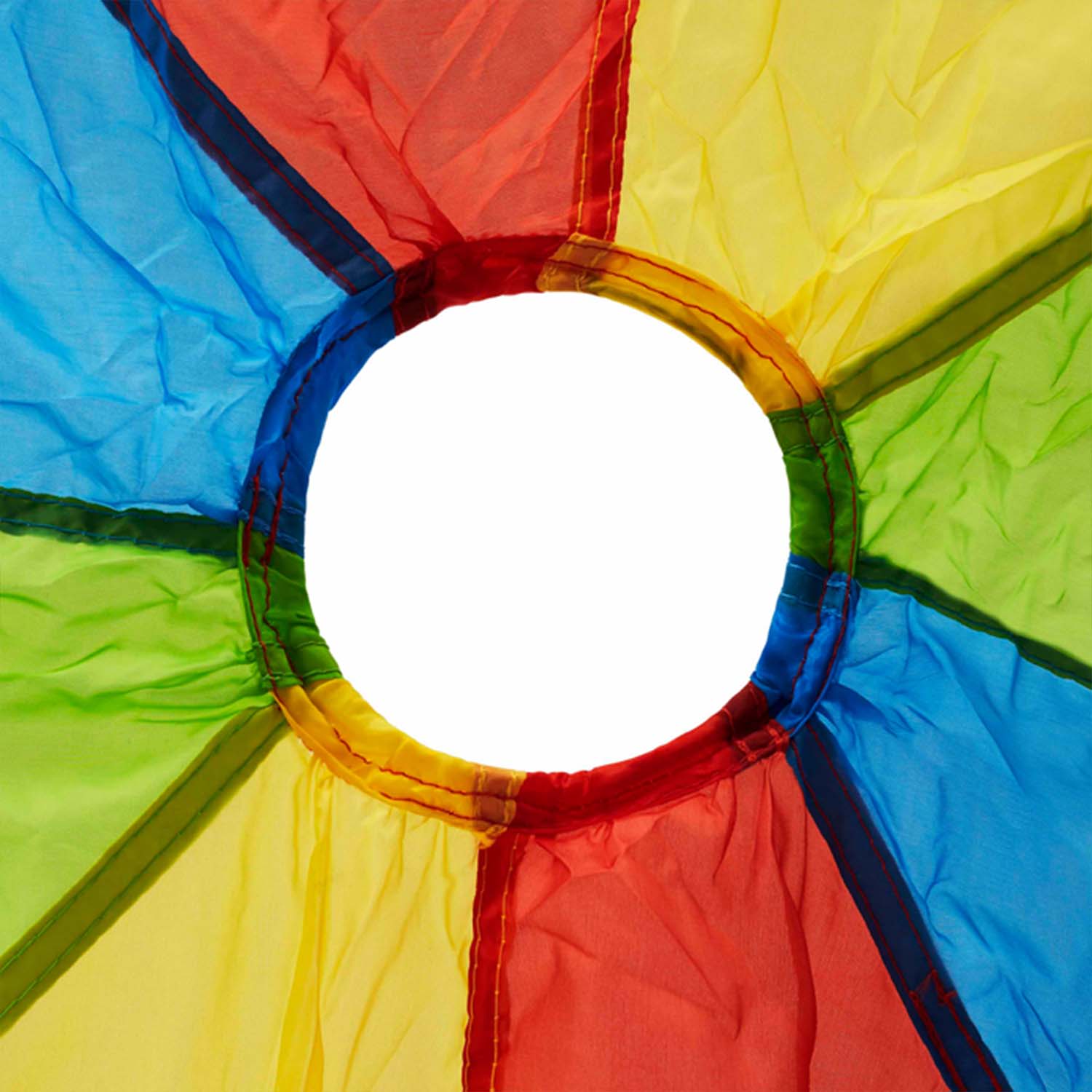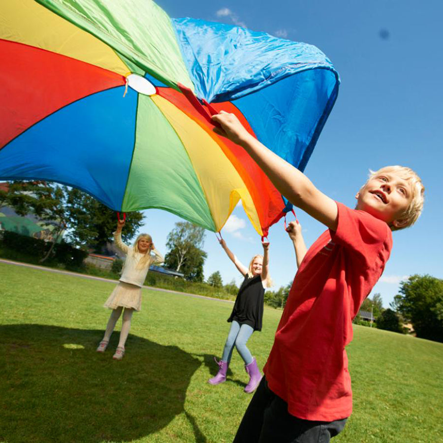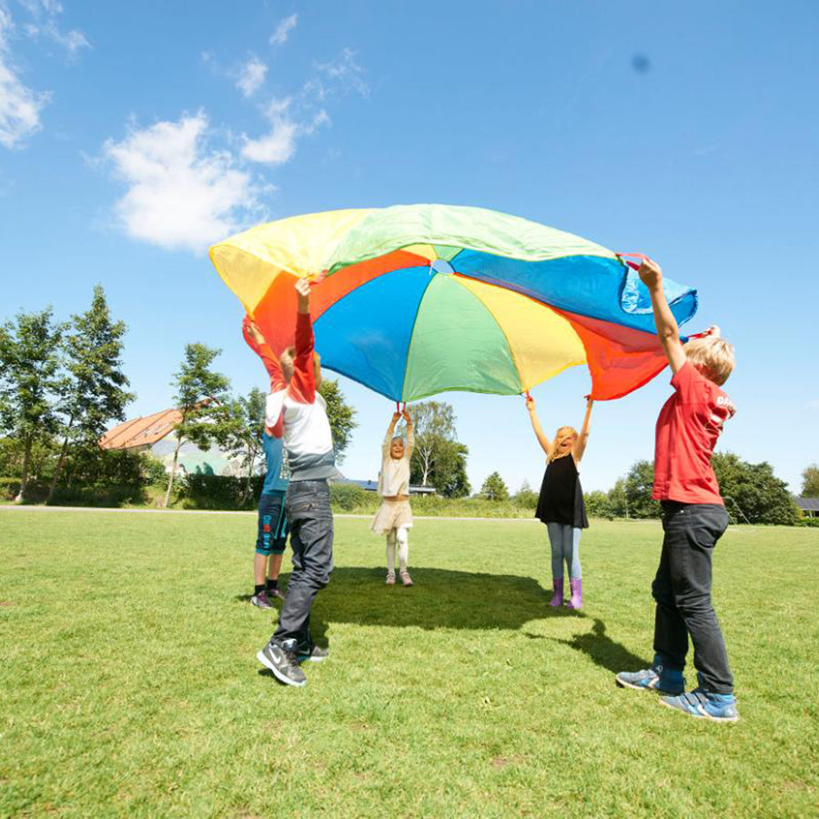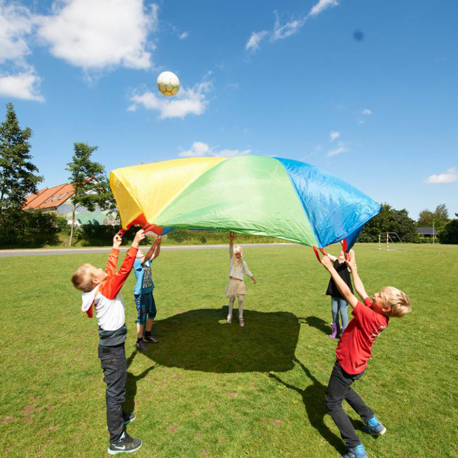 Playing with the parachute provides exercise for the whole body for all ages, and is a wonderful way to develop basic physical coordination. Made of colourful, lightweight, fire-resistant polyester with very strong handles, the parachute inspires many different games and activities. A strong 10 mm thick rope is sewn into the outer edge, allowing an almost unlimited number of people to play at the same time.