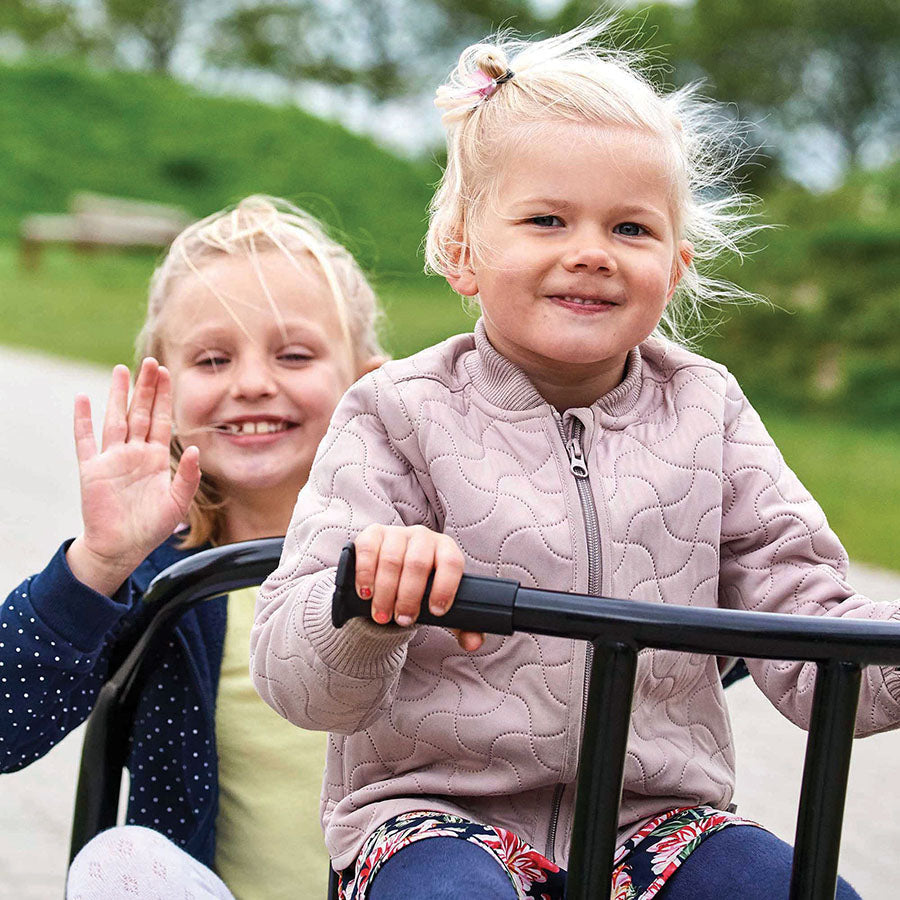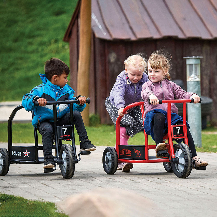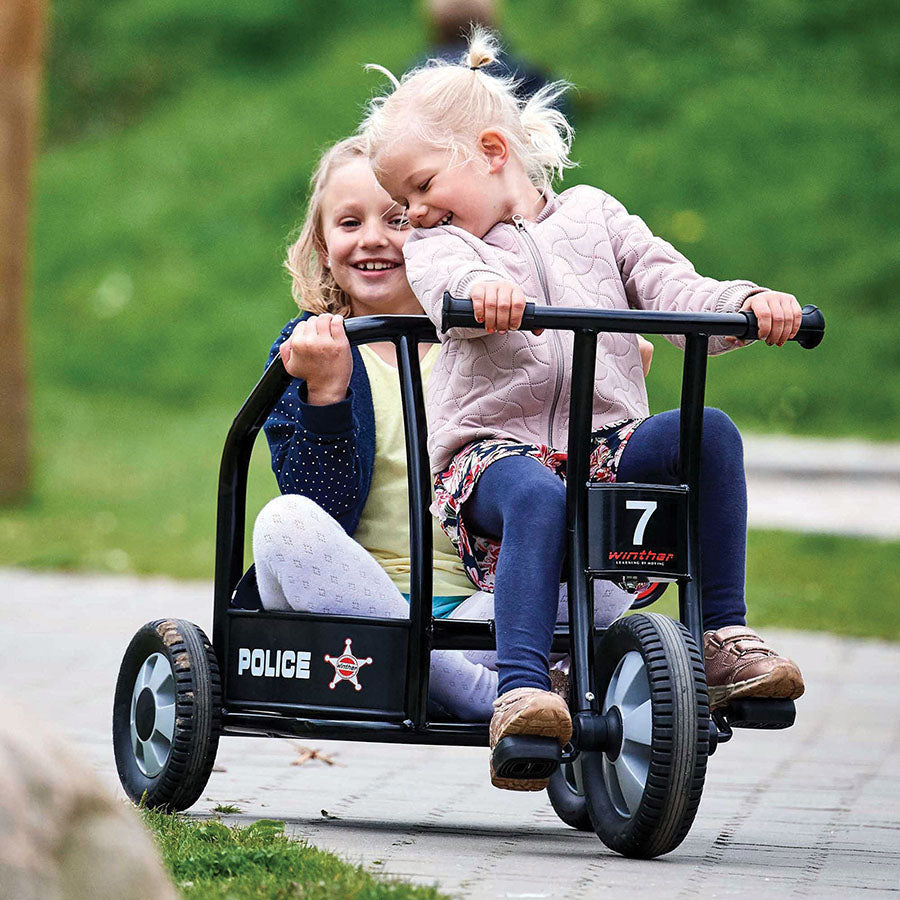 All bad guys better watch out. The police are here. This cool, black trike has room for two little officers of the law and is a natural centre for social activities on the playground. It sports excellent play value and also strengthens child motor abilities and reflexes.