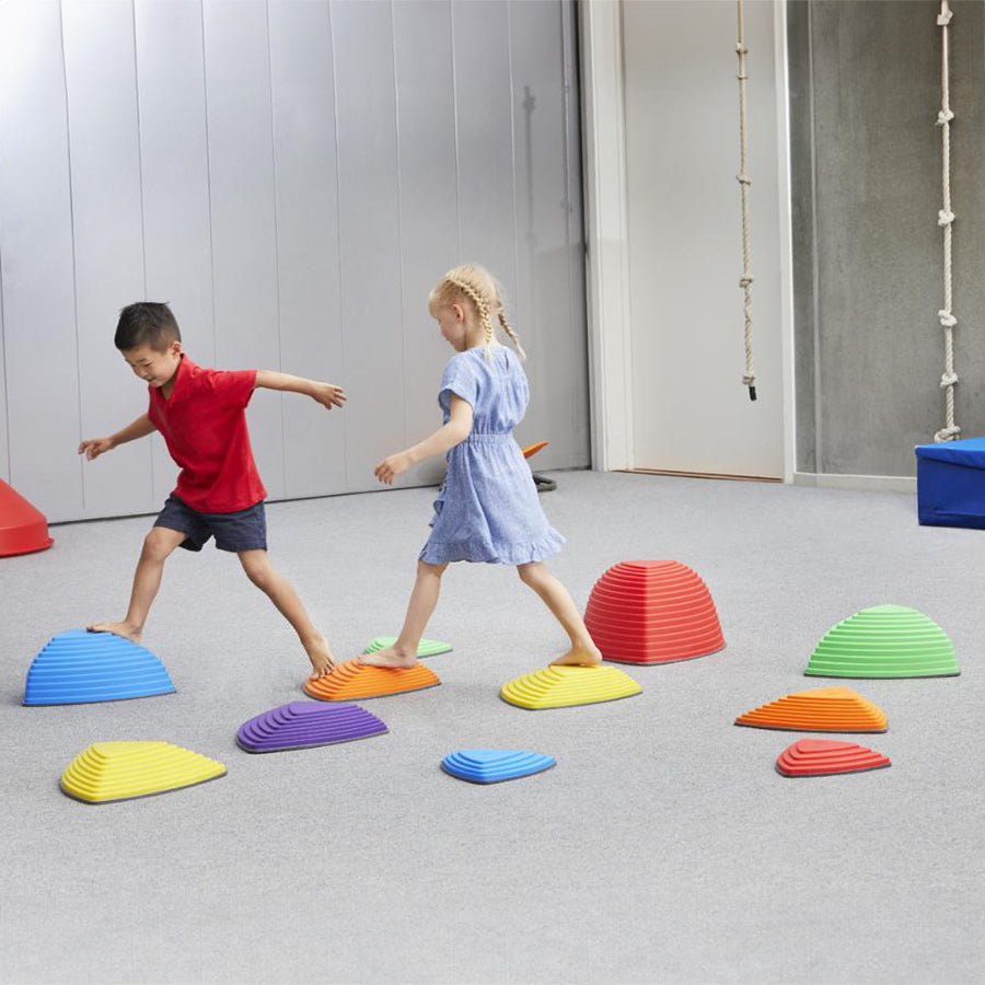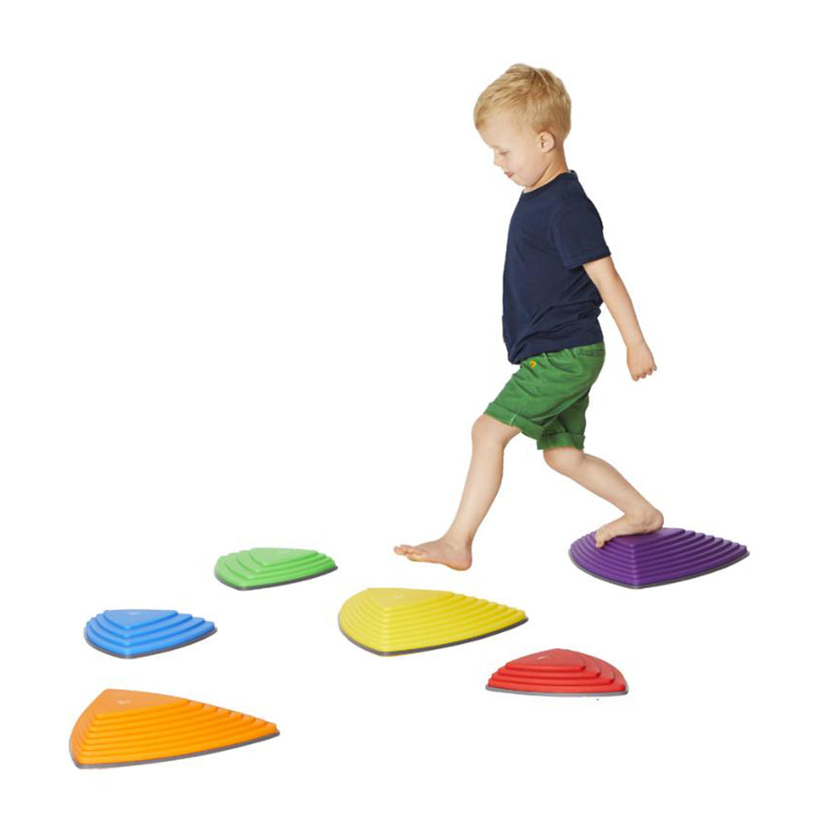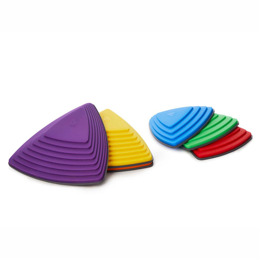 Stepping stones to better coordination, balance and fun. The River Stones are inspired by stepping stones in a river with each side of the triangle varying in steepness and difficulty. The purpose is to jump from stone to stone without touching the floor - you can vary the position of the stones to create more challenging paths for children. Each stone has a rubber rim on the base which prevent them from slipping, and also protect indoor floor areas.