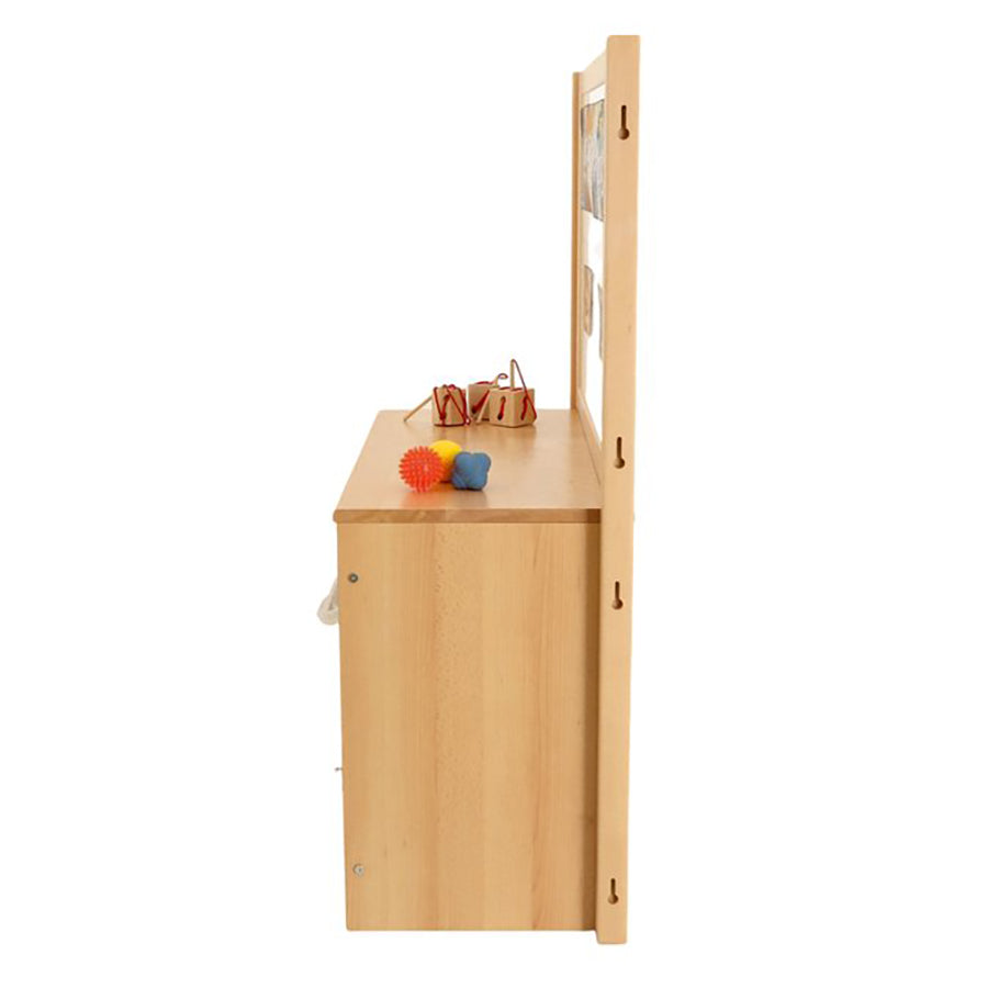 The RS Angled Tidy with trays and drywipe/mirror divider is part of the RS range and is supplied with 6 shallow trays. This can be a stand-alone unit or part of the Room Scene range and when connected with other RS units it offers you to create boundaries in the classroom and nursery. Manufactured from solid beech and 18mm beech faced MFC with ABS edging.