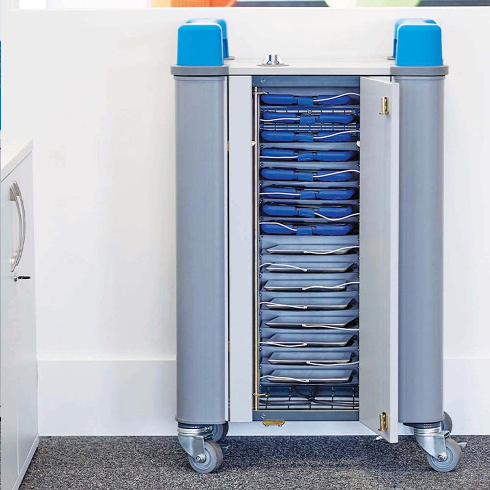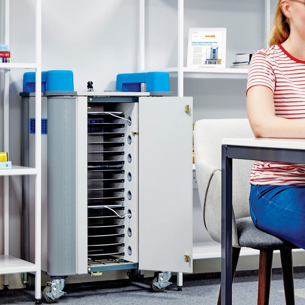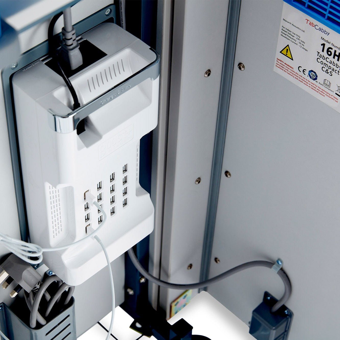 The TabCabby 16 Horizontal Compact Charge & Sync charges 16 tablets up to 11″ screen size, including protective cases, plus mobile phones, POS, Kindle, Android, Surface or any other USB chargeable equipment via a 16 port USB A Hub. With horizontal storage shelves it simultaneously charges & synchronises with the Boost+ 16-USB, a managed hub mounted in the side of the cart, delivering high-speed charging and syncing saving time when deploying apps, media and content.