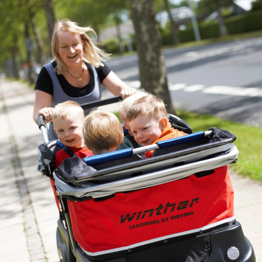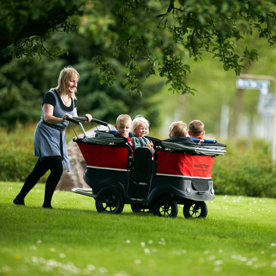 The Turtle Kiddy Bus makes children want to go for lots of outdoor rides. It makes outdoor activities easier and safer for both children and adults. The Kiddy Bus is not only robust, it also features a well-thought-of design that focuses on safety, durability and ergonomics. It is combined with a number of practical details and - of course - room to do what children do. The children sit in pairs opposite each other, making it easy to talk with their friends. They get in and out through a side door, just like in a real bus. It is fun for children, and it saves adults the strain of repeated heavy lifting.