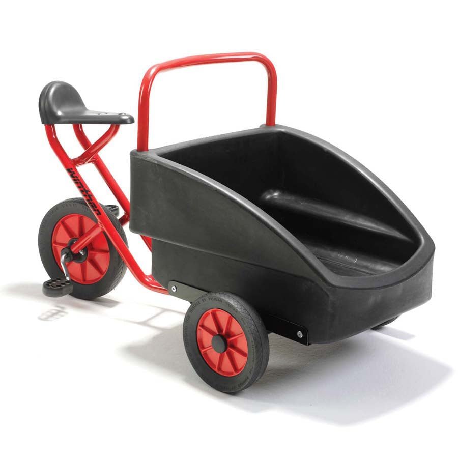 With this fun trike children can deliver sand and toys all over the playground. The trike has a striking resemblance with a cargo bike and unlike the traditional delivery bike it has a real box in front instead of a step plate.